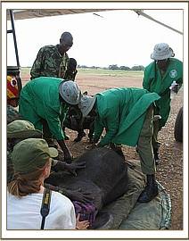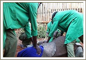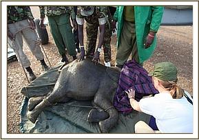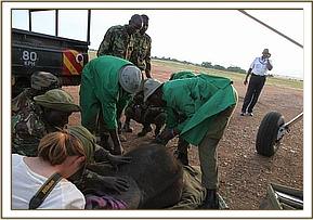 On arrival at the Borana airstrip the SWT team could already see how stressed the calf was, as is the case with all of the orphans who are forced to endure such a traumatic ordeal, so the calf was given a small dose of Stresnil as well as the precautionary Nuroclav to guard her against pneumonia resulting from a weakened immune system.