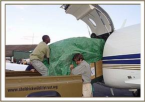 Madiba in his crate is carefully lowered onto the DSWT landrover