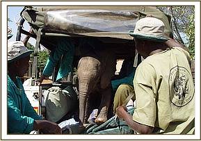 On closer inspection they discovered a tiny calf, confused, alone and abandoned with no elephants to be seen any where in the area. The baby, desperate for company, followed them back to their camp, and from there the rangers contacted Sean Outram who works on the ranch and told him about their tiny little orphan. Sean drove to the camp and collected the calf, and loaded her in the back of his vehicle, contacted the Trust in Nairobi, and headed to the closest airstrip to wait for the rescue aircraft.
