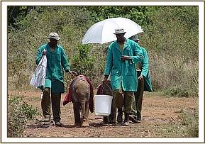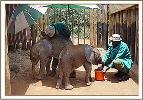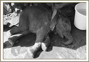 After taking some rehydration her front legs and back legs were carefully tied and she was loaded into the small plane and flown directly to Wilson Airport in Nairobi. The moment she stepped onto the airfield apron she lay down and rolled around on the loose gravel, enchanting all those that looked on with absolute amazement and she seemed oblivious to the busy airport around her. Later she followed Benson past the aeroplanes, the fuel bowsers and the gawking onlookers to the aircraft hanger where a land rover waited to transport her the short distance between Wilson Airport to the Trust’s Nursery in Nairobi National Park. No one could believe this tiny fuzzy bundle of mischief, who soon took over the Nursery compound. After a drink of water and a splash and spill from the bucket she flopped down wiggling away in the small muddy patch which had formed as a result of the spilt water. One by one all the Keepers came to view this cheeky little newcomer who was happy to follow everyone and anyone.