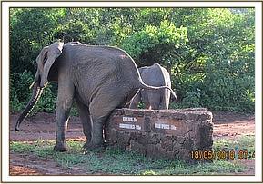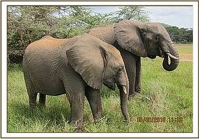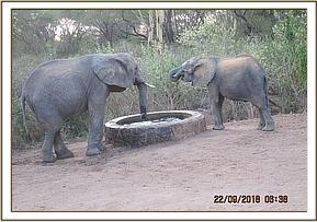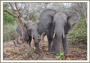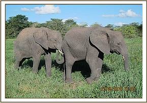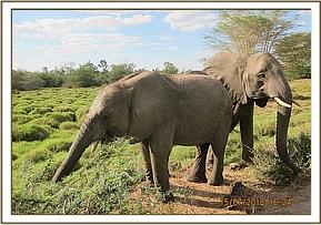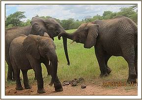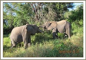 Ngasha and Murera hold trunks in greeting