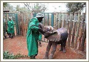 Weak and in a pitiful state this little bull was so relieved to find himself near other elephants and humans that were kind and loving, with access to milk and water, that he was calmed very quickly and relished his good fortune. He has been named Nyika (The term commonly used for the arid scrubland comiphera bush that is indigenous to the area of his rescue, which was formally known as the Taru desert). His stools were pure mud to begin with, indicating the harsh conditions to which he was tragically subjected following the loss of his mother and her life sustaining milk.