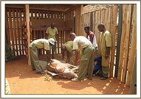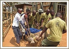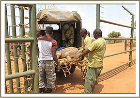 They immediately reported this to the KWS authorities who confirmed that he should be captured and held safely overnight so that the rescue team could move in in daylight hours. Our Voi Elephant Keepers travelled there the following day, 29th July, and he was driven to the Voi stockades to await the arrival of the rescue plane to airlift him to the Nairobi Nursery.