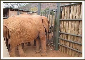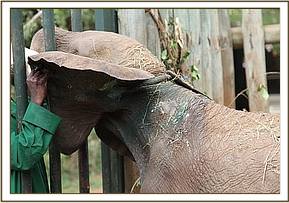 He was 2 years old, tiny tusks already protruding through the lip, and although emaciated, was not in life threatening physical condition. He was also very calm for a newcomer of this age, and by nightfall was taking milk from a hand-held bottle, and even sucking on the Keeper’s fingers, albeit on the other side of the Taming Stockade partition. He is a very lucky little elephant to have escaped severe spearing and been rescued in time and as soon as he is stabilized, will be a candidate for Ithumba, there to join other two year olds who have already sprouted tusks.