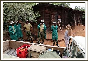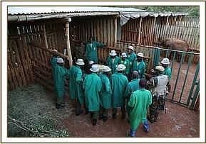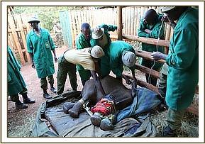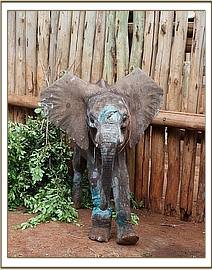 He finally arrived at 6.00pm at the Nairobi Nursery and his wounds were cleaned and treated, packed with green clay, and antibiotics administered. While he was still prone the Keepers lifted his head so that he might get the taste of milk. Amazingly he fed well on a bottle of milk, suckling beautifully before being helped to his feet. Once up everybody had to make a hasty retreat over the stockade walls as he charged around clearly extremely confused by events. There were rumbles of communication from the next-door stockades with both Elkerama (recently rescued) and Arruba his immediate neighbors extremely interested in the new arrival. He knew then he was amongst his own kind, which was reassuring for him.
