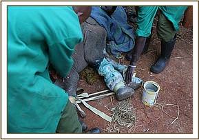 Together with KWS the SWT team tracked the calf a short distance before they sighted him and were able to capture the one year old without too much resistance. He had not managed to walk too far from where he was sighted the previous day, and he was unable to put up too much of a struggle due to his compromised leg and weakened state. He was laid on a mattress with a blanket covering his eyes while his legs were strapped. Without delay the calf was loaded onto the back of a land cruiser and driven to the airstrip, which was thankfully close by.