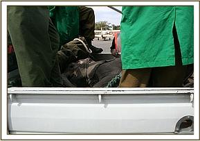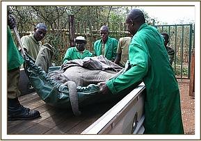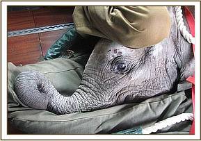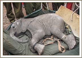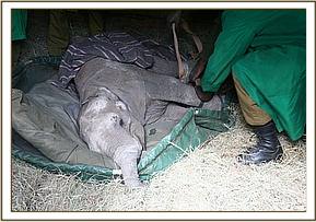 August coincides with the height of the wildebeest migratory spectacle in the Masai Mara, so all Charter Companies that operate out of Wilson Airport are kept busy. The first available plane could only leave Nairobi at 11.30 a.m. landing at Taita Hills Sanctuary at about 1 p.m. Aboard were three Nursery Elephant Keepers, including Edwin Lusichi, who was able to administer the first of the usual course of injectible antibiotic. The calf was then surrounded by the Keepers who steered it to the waiting plane before being laid down on the rescue tarpaulin with bound legs and loaded onto the plane for the flight back. The Trust’s Pickup truck was waiting at Wilson Airport to take the calf back to the Nursery. He arrived there in the late afternoon and was carried recumbent into a stable that had been prepared for him next door to that occupied by Shimba and Dida. Daphne and Angela were in Tsavo at the time, keeping in close touch with Lina Sideras and the Keepers by mobile phone and decided that the new arrival be named “Taveta”, the name of the border town on the Kenya Tanzanian border which is not far from both the Taita Hills Sanctuary and the Southern part of Tsavo West National Park.