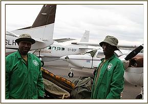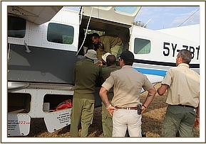 Meanwhile Dr Poghon, the SWT’s Kenya Wildlife Service field veterinarian had mobilised a rescue team from the Voi elephant stockades and located the calf, managing to capture the young and feisty bull and restrain him in order to get him into the vehicle and safely to the Voi airstrip where the rescue plane and the Nairobi team would meet them.