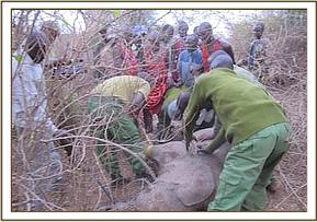 Our SWT/KWS Ziwani Anti-Poaching Team and some of the Voi Elephant Keepers found and rescued the calf during the afternoon of the 27th August 2011, after which he was driven to the Voi Stockades for the night, comforted by the presence of the Keeper Dependent babies based there.