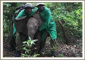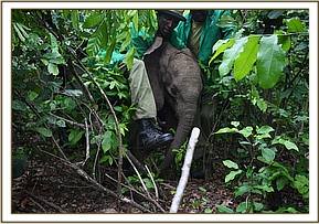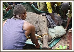 Early next morning everyone was up at dawn in an effort to complete the rescue. The rescue kit was loaded into the back of a tractor and the journey began at 6:00am. The road to Ndera from Kotile where they spent the night was even more flooded than the one traveled the previous day. The team reached the banks of the Tana River, furtile with an abundance of Mango and banana trees. Here the Keepers met up with eight more Kenya Police Reservists and Abdi our Keeper was able to brief everyone how best to assist with the elephant capture. With the dense vegetation conditions were tough, with only fleeting glimpses of the calf before she was once again lost. The team set off on foot combing the bushes. Eventually she was spotted and our Keepers rushed in to restrain her, she was allot smaller than anticipated. After capture she was prepared for the long journey back to the airstrip which took over 5 hours in the blazing heat, and flooded conditions – so many people did so much and worked so hard to ensure this calf was brought to safety.