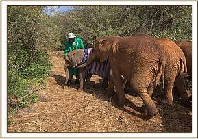 The following day she joined the Nursery orphans and was overwhelmed to experience all the attention and an instant elephant family once more. As a result she immersed herself into Nursery life, and in no time began playing in the mudbath with the others. She had had such a long time on her own, mourning the loss of her family, that to be rescued and reunited with elephants came as such a huge relief that she has embraced it from day one. She is extremely pampered with all the other orphans, with the exception of a jealous Kainuk, showering her with love.