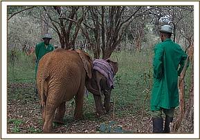 We called the calf Ishaq – B after the area and the men that had contributed so much to her survival and eventual rescue. She is a remarkable baby, as despite being encumbered by her swollen back knee, that seems to be improving with each passing day, she is unbelievably tough, surviving one of the most grueling rescues ever, but also 3 weeks without Mum. This is the baffling bit, because a milk dependent calf her age would normally be dead after three weeks without milk. We think it was because she was living off mangos dropped to the ground by the marauding baboons in the area that she lasted as long as she did. They provided her with the company she needed as well, as it was reported to us that she spent time with the baboon troop.