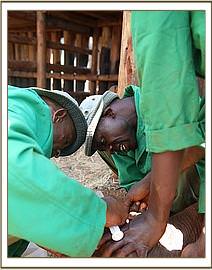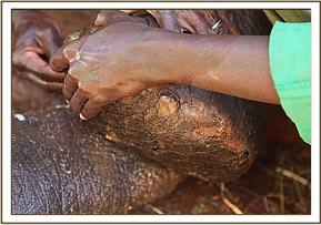 Piers alerted us about the orphan, sending along photographs so we could assess her size and age. He then drove to KWS Headquarters to get permission to rescue her. Meanwhile, we flew a team of Keepers up to Meru. Upon landing, everyone gathered at the orphan’s location. By late afternoon, the calf was en route to the Nursery. Everyone was taken aback by her condition: She had trodden on an elephant spike trap, which ravaged her hind leg and left her with deep, poisoned wounds. While struggling in vain to keep up with her herd, she must have fallen and dislocated her leg joints, because her entire hind area was debilitated. Her little forehead was etched in pain, a heartbreaking reminder of the trauma unfolding within. The memories of what humans had inflicted upon her was still fresh in her mind, and despite being severely incapacitated, she was very wild and rebuffed all help.