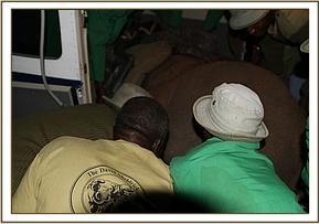 The day after her rescue, Murera collapsed and had to be put on life support. This gave us a chance to take a closer look at the extent of her injuries and clean out her wounds. For a long time, she couldn’t put any weight on her hind legs. All the Nursery orphans would crowd around her stable, giving her rumbles of love and encouragement.