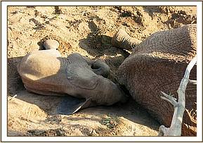 Cherie was monitored over night with a rescue team ready to retrieve her young calf if the worse should happen. However, on the morning of the 8th April Cherie was found on her feet feeding, with her calf suckling and her family all around her. Everyone’s hopes were briefly lifted but sadly it was not to be. By the afternoon Cherie again lay down on the river bank and seemed to be fading away. Her calf now too seemed to be appearing weaker and more listless, as if he hadn’t been getting enough milk. The team was torn between rescuing the young calf, which would mean euthanizing Cherie, or giving her another chance to make a recovery.