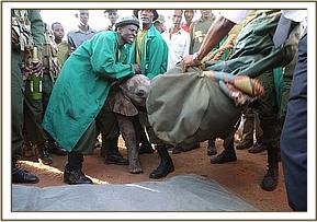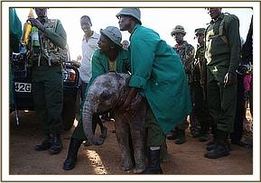 The angry community of Kimanjo had set upon the baby in revenge spearing her several times. When she took refuge in the grounds of a nearby school the children began stoning her. Very swiftly the warden of the Naibunga Conservancy came to the calf’s rescue and kept her safe from the community who were baying for her blood in retaliation for recent events. While in close communications with KWS who were trying to instill calm to a difficult situation, the SWT rescue team were sent from Nairobi departing at 3.00pm from Wilson airport. After a one hour flight they arrived on the Ol Lentille airstrip and were immediately collected by a KWS land cruiser and taken to a nearby village where the calf was.