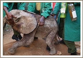 Still the community surrounding the scene remained agitated and determined that the calf should not be rescued and removed from there. KWS along with the Conservancy personnel worked tirelessly trying to instill some understanding. It was a heartbreaking scene for our team to find the calf secured on the floor of a class, stressed, injured from the attacks, and extremely traumatized. Our team set about attending to the tiny baby elephant, all the while communicating with the community trying to explain things while preparing her for the journey back to the safety of the SWT Nursery in Nairobi National Park. She had experienced unimaginable trauma that day, and was extremely lucky to still be alive, all thanks to the swift work of the Naibunga Conservancy warden called Peter. She responded to the tender loving care that she received from our team of keepers and fed well, clearly dehydrated by this time.