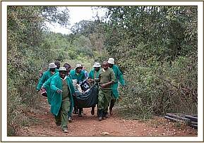 Equipped with a handheld radio the ranger immediately reported the incident to Helen. Helen, having rescued several elephant calves before, made a call to the The Sheldrick Wildlife Trust headquarters without delay, but realizing that the hour was too late for a rescue that day everything was planned for the next day. The ranger was then tasked with hurrying back up the mountain with the community messenger to collect GPS coordinates of the baby’s location to help with the rescue and continue to care for the calf with instructions from the Sheldrick Wildlife Trust.