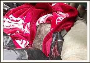 Delayed slightly by poor weather conditions, the helicopter arrived at the Nursery by 10am, sending clouds of dust into the air as it landed smoothly at the mud bath area. As soon as the engine had stilled the doors were opened and the Keepers laid eyes on a little red bundle, a bundle that couldn’t weigh more than 40kgs. Carrying the calf easily in their outstretched arms across the mud bath area he was laid in blankets in one of the warm stables and unwrapped. What was revealed was the smallest elephant ever to come into our care. It was thought this tiny baby must have been premature he was so small. He was immediately fed a fresh mixture of milk formula, which he hungrily accepted, before being put on a life saving drip.