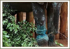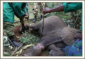 He finally arrived at 6.00pm at the Nairobi Nursery and his wounds were cleaned and treated, packed with green clay, and antibiotics administered. While he was still prone the Keepers lifted his head so that he might get the taste of milk. Amazingly he fed well on a bottle of milk, suckling beautifully before being helped to his feet. Once up everybody had to make a hasty retreat over the stockade walls as he charged around clearly extremely confused by events. There were rumbles of communication from the next-door stockades with both Elkerama (recently rescued) and Arruba his immediate neighbors extremely interested in the new arrival. He knew then he was amongst his own kind, which was reassuring for him.