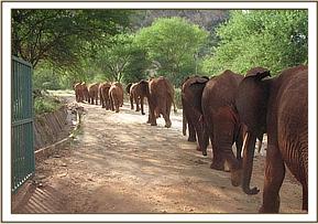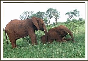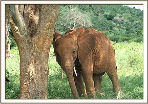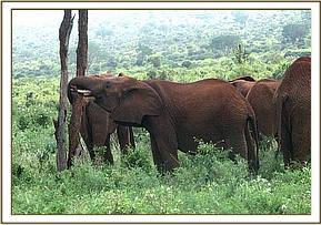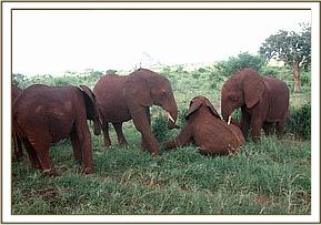 The youngsters left the Stockade without Natumi’s group, and pacing fast past a wild herd, went in search of their mates. The wild elephants stretched their trunks to smell and give them a welcoming gesture, but the orphans were set on linking up with Natumi’s group, who were further down the northern side of Mazinga Hill. Having joined up, they fed happily together for the rest of the day. Morani won a shoving match with Mpala, and became so excited that he rolled around on the soft soil, rising to head butt Mpala again. The two then had to catch up with the others who were on their way back home.