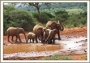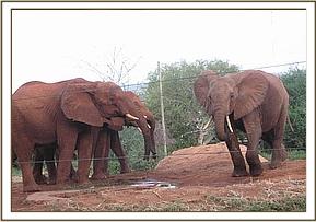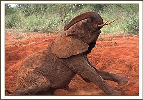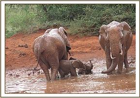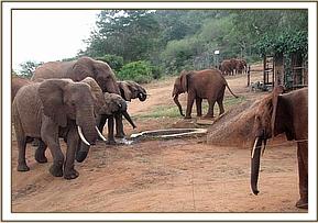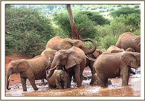 When Natumi’s and Thoma’s groups joined up in the morning, the greeting was, as usual, rowdy and joyous. Trumpets filled the air with huge chunks of dust being tossed around, as the orphans indulged in a game of hide and seek. Sosian, who has always been greedy, decided to abandon the game and escort Mweiga out to feed, which prompted the others to run and join them, carrying on the hide and seek games as they went along. All enjoyed the mudbath, after which there was serious feeding, until Laikipia led them back for the Copra Cake.