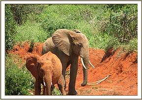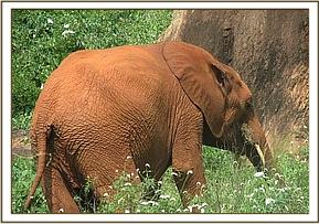 Thoma’s group (the youngsters who remain in the Stockade during the hours of darkness) left early on their own, without being accompanied by the older orphans who now spend the nights out. The two groups linked up out in the bush an hour later, to be joined by a wild elephant herd who were feeding near the orphans’ waterhole. The wild herd allowed two of their number to join the orphans at the mudbath, and after a soil dusting session, the orphans and their wild friends again mingled with the wild herd. One teenaged wild boy paid a lot of attention to Edie, sniffing her genitals. When the orphans began returning to the Night Stockades in the evening, the wild group headed towards the Voi river.