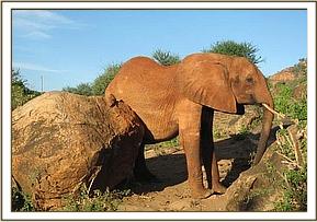 Thoma’s group rushed out of the Stockades, eager to meet up with Natumi’s group. Morani enjoyed several stop-overs to feed en route, while Thoma was bent on meeting the others. Soon they spotted the older group, and joined them, again greeted with great joy and exuberance. Morani enjoyed feeding close to Mukwaju, since his two favourites, Ndara and Loisaba, are now with Emily. Salama lay down in an attempt to attract Thoma while Icholta watched closely nearly. Sosian found a tree-trunk which he enjoyed pushing around using his head. They all enjoyed the mudbath, and fed near the waterhole for the remainder of the day before returning.