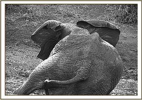 It was another very hot day, so the orphans went to the mudbath early. Afterwards they fed close to the waterhole, going back into the water every now and then to cool themselves off. They fed on their way back in the evening.