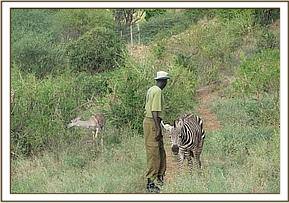Serena, the orphaned zebra, was taken by a Keeper for about 2 kms. to the Northern side of the hill, hoping to make contact with some wild zebras, but she was very nervous and would not leave the Keeper. They both returned together, because no wild zebras were seen.