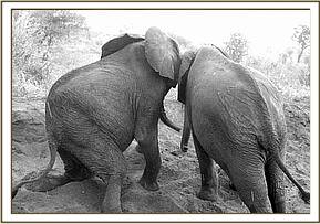 The youngsters emerged with great jubilation since Natumi’s group was there to escort them. There were initial games around the Stockade before heading out to feed. At the foot of Mazinga Hill, there was confusion, since Mukwaju and the bigger boys wanted to go up the hill, and Natumi’s group preferred to feed on the lower slopes. Mweiga was glad of their company until it was time for the mudbath, after which they all fed close to the waterhole before returning in the evening.