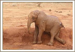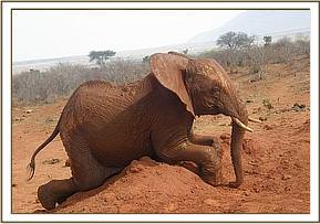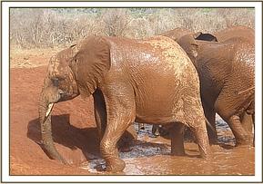 The orphans later made their way to the middle water hole in groups of five. After the milk feeding they were undecided as to whether or not to have a mud bath. Kihari and Rorogoi decided that they would have a wallow and plunged into the water while the others stood around watching their antics and games. Mbirikani kept touching the water to test the temperature but was not brave enough to join Kihari and Rorogoi. When the two exited the water the orphans all enjoyed a dust bath.