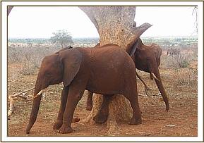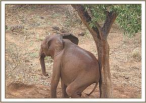 Soon some rain sprinkles started at 4.15pm, a little before the orphans were to head home for the night. Suswa got a fright from Rorogoi who came charging past her and Ajali and she ran to rejoin the group. Their running precipitated the orphan herds return to the stockades for the night. Kenia and Araba stopped for a scratching session against a tree trunk before catching up with the rest of the group.