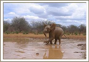 The orphans left the Stockades this morning in a jovial mood, swinging their trunks from side to side, and bumping into one another.   At 9 a.m. Sunyei, Challa, Rapsu and Buchuma had a playful time running and charging around the thickets.   At the mudbath Naserian, Rapsu, Olmalo and Napasha had a wonderful wallowing session, Rapsu putting his head under the water.   Later Napasha challenged Kinna to a bout of pushing and was defeated, running away as fast as his legs could carry him!