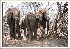 Mulika, with Selengai walking beside her, led the orphans out to feed today.   Because all the trees are now leafless, the orphans stripped the bark, dug up roots using their forefeet and ate the tender shrub tops.   Yatta led the orphans to the mudwallow to cool themselves, and all enjoyed this wallowing activity fully.