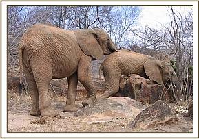 At around 10 a.m. Rapsu and Wendi spent time playing on the ground, rolling around and soil bathing.   Buchuma, on seeing this, came slowly to join them and all enjoyed the game until they joined the rest of the elephants who were feeding.   It was an active mudbath today because it was so hot.