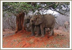 It was another hot day.   Out in the bush, Sunyei was up to her usual trick of rushing out of the thickets to scare the others, which brought the feeding activity to a halt as the babies ran to the Keepers and the older elephants kept silent with outspread ears to determine whether anything posed a threat!   The Keepers reassured the orphans that it was just a hoax.   After the mudbath it was so hot that the elephants sought shade under a tree.