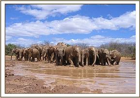 The day began hot, so after a drink at the Stockade trough, the orphans headed out, led by Kinna and Mulika.   Later Sunyei, Galana, Challa and Kinna separated from the rest of the group and went to feed far away, but returned to join the others at the mud wallow, which all the orphans greatly enjoyed.