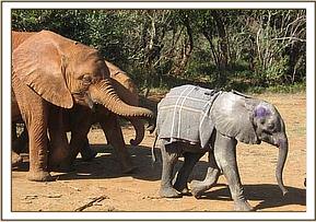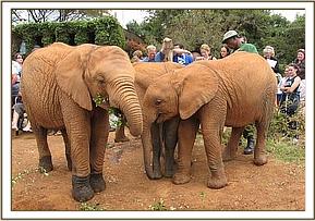 The Chyulu orphan, (named Chyulu) arrived in the Nursery at midday, and immediately wanted to be with the other elephants, rather than alone.   Loijuk took a great interest in her, and Makena was also very excited.