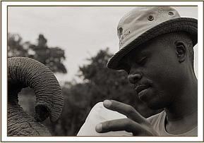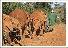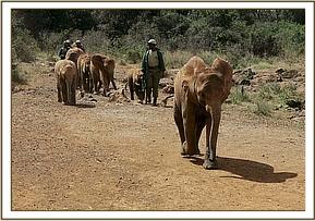 All the orphans were very playful today, running up and down trumpeting and breaking down small shrubs, an activity that even little Chyulu enjoyed.   Shida escaped from the Keepers at l0 a.m. in the morning and did not return to his Stockade until l0 p.m. at night, having enjoyed chasing the giraffe around the rocks at 6 p.m.   When he eventually came back, he was accompanied by an adult wild who escorted him back home.