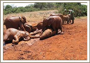 It was a busy day in the Nursery, with all the elephants very playful, especially when they played football at the mudbath.   The Keepers always think that when the orphans are happy and playful, another orphan is on its way.   Amazingly, at about 5.30 p.m. we received a call from the Trust’s Chyulu De-Snaring Unit that they had rescued a female orphan that was stuck in mud in the community area.   As it was too late to organise an airlift to Nairobi, we alerted Angela Sheldrick at the Mtito Trust House, who decided that the orphan be driven to the Voi Stockades for the night.