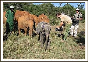 Very early this morning, the BBC crew accompanied the orphans into the forest when they left their night quarters.   Chyulu kept on smelling the camera man and then smelling a Keeper, wondering why there was a difference!   Makena played happily with Chyulu and Lualeni, closely watched by Loijuk, who was denied participation in the game by Lualeni.