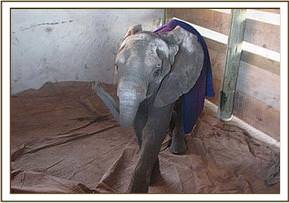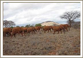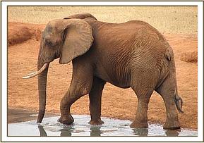 The orphans left the Stockades in a happy mood, swinging their trunks from side to side.   Moving to the mudbath, Icholta and Natumi had difficulty in deciding who should lead, walking parallel to one another with distance between them to avoid confrontation.   Burra marched between the two, and rushed to be first at the milk venue.   None of the elephants went into the mud today because it was windy and cool, but Burra, who is always eager to go in, tested the temperature of the water with his foot and decided against it.