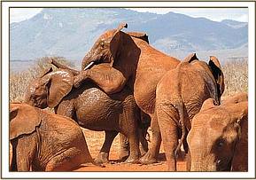 It was a beautiful morning when the orphans began the journey out to the Northern feeding area.   Natumi and Icholta confronted each other in a contest for leadership, which could have developed into a tough fight had the Keepers not intervened.   Meanwhile Laikipia and Edie led the orphans to the mudbath where Burra and Ndara plunged into the water first followed by Thoma.   Ndara wallowed with such enthusiasm that she had difficulty getting up on the slippery slope, so Loisaba and Irima came to her rescue, standing on either side of her to give her a helping trunk lift!   After spending a long time at the mudbath, the orphans then continued feeding for the rest of the afternoon until it was time to head back home.