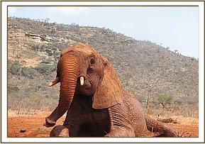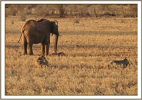 Burra and Solango, who led the way to the mudbath, came running back because they encountered a lone buffalo, which ran off when it saw the Keepers.   Today was a very sad and fateful day for all the Keepers when around 5.55 p.m. we received a message from a KWS Officer to go and try and rescue a baby elephant which was being snatched from its mother by a pride of lions.   A rapid response team was assembled and within l0 minutes we were at the spot, below the Voi Safari Lodge, about 300 metres from the Lodge waterhole.   We were astounded to see that the mother of the calf was, in fact, none other than our ex orphan, Mpenzi, who had given birth the previous day at around 11 a.m. and came with her newborn calf to drink at the Lodge waterhole.   On the way she was ambushed by 12 lions who immediately surrounded her and although Mpenzi did her utmost to save her baby by chasing off the lions, it was to no avail.   When she attached one, the others jumped onto the newborn calf and very quickly killed it.   By the time we reached Mpenzi, it was already far too late to help her, for the calf was already dead but Mpenzi was still desperately trying to keep them off the body, bravely confronting them, although she herself must have been terrified since the lions were making a huge noise.    She knew we had come to help, and we did our best to try to do so, but as darkness closed in, both we, and Mpenzi had to leave.   She ran off as we left, fortunately unscathed herself.   All the Keepers were distraught for we retain a great fondness for Mpenzi, whom we reared from a very early age, and knew well.   We grieve for her loss.   One of the lions had a snare round its neck, but when the mobile Veterinary unit returned in the morning, it could not be found.