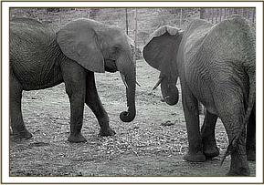 En route to the northern feeding grounds, Nyiro and Natumi halted, put their heads together, touching one another as though having a consultation about some matter.   They were interrupted by Salama, who came barging through them.   Having taken water at the mudbath, Mweiga led the way to the mudwallow, swinging her trunk happily left and right and also between her legs.   She enjoyed the bath with the others.   Later they fed on the eastern side of the hill until it was time for Laikipia to lead them back in the evening.