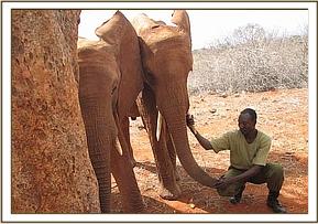 Today the orphans enjoyed a game of hide and seek around the stockades, and were having so much fun that they were reluctant to break off in order to move off to the feeding area.   In the end the Keepers had to initiate the exodus.   They fed peacefully and well, with no wild encounters, since most of the other animals have all moved to the Voi River, leaving only the zebra and impala who share the orphans’ water rations.