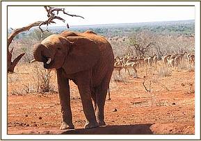 This morning, the greeting between the orphans when they emerged from the Stockades was highly charged, with urinating and trunk reaching to touch one another.   They then all raced off down the hill exuberantly heading out to the feeding area.   At mudbath, a herd of impalas was at the water bins, who moved away slowly to allow the orphans access.   Ndara, Natumi and Salama had a wonderful session soil dusting, tossing huge clouds of dust into the air.   In the evening Irima enjoyed a ride on Burra’s back for a short distance before being dislodged after which Morani engaged Burra in a test of strength that lasted until they reached the Spring Gates near the Stockades.