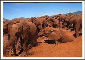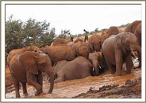 It was a wonderful mudbath today, because all the orphans plunged in, trumpeting with excitement.   Mukwaju, Ndara and Morani put on a spectacular display, charging through the water and making a great deal of happy noises.   Laikipia lay down with Nyiro, Loisaba and Thoma standing beside him.   Mpala won the competition for best swimmer and remained in the wallow long after the others had left.