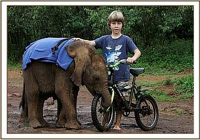 The new orphan, Kenze, survived the night, but was still comatose in the morning, having received many pints of intravenous drip during the night. Mrs. Sheldrick made some oatmeal and coconut cakes, which we placed in his mouth during the night, and which he slowly swallowed, but he could not be given milk for fear of it getting into his lungs. At 2 p.m., we managed to get him onto his feet, and after a few minutes, he was sufficiently strong to try and charge his Keepers again, and still resisted taking milk.